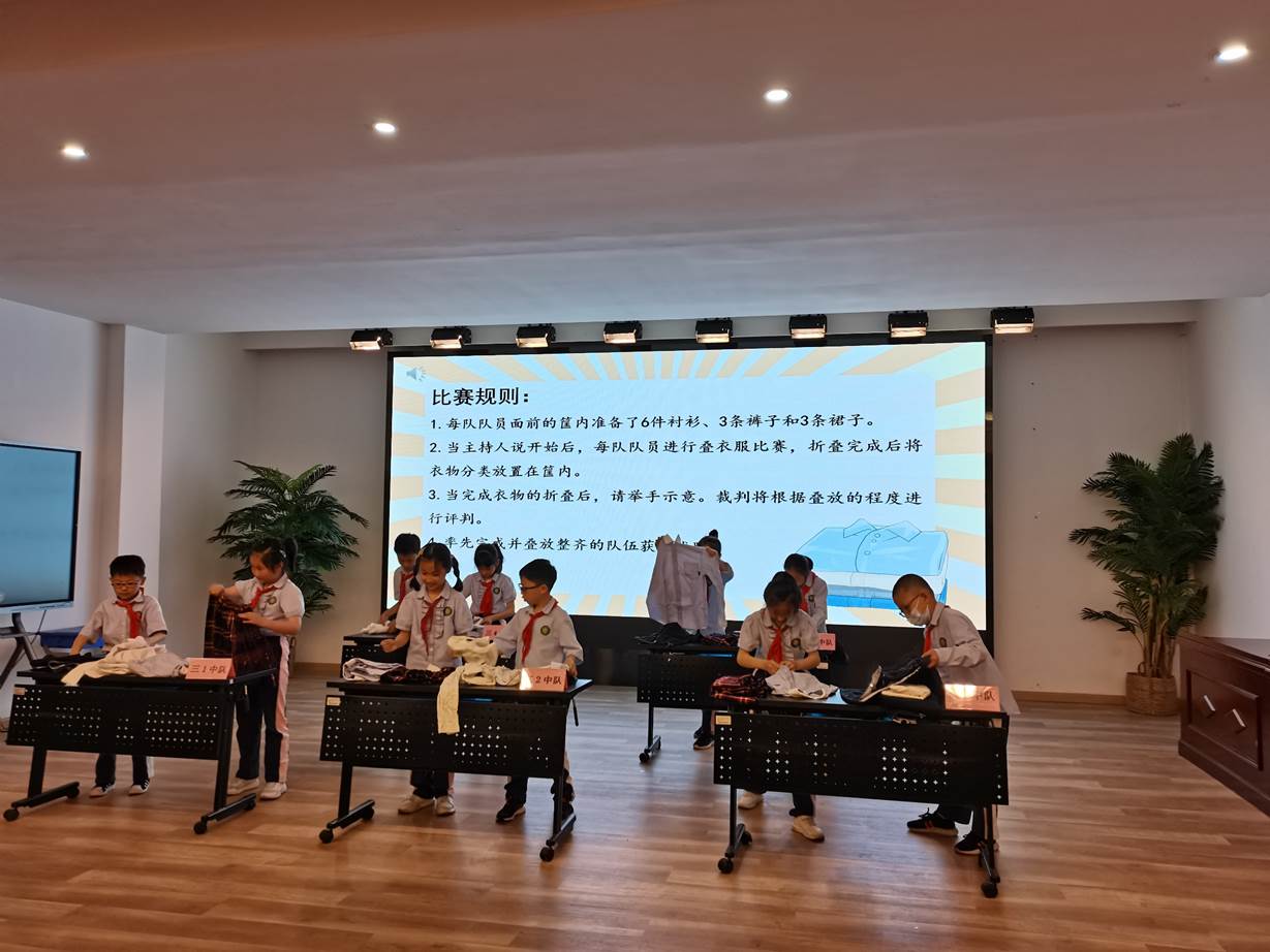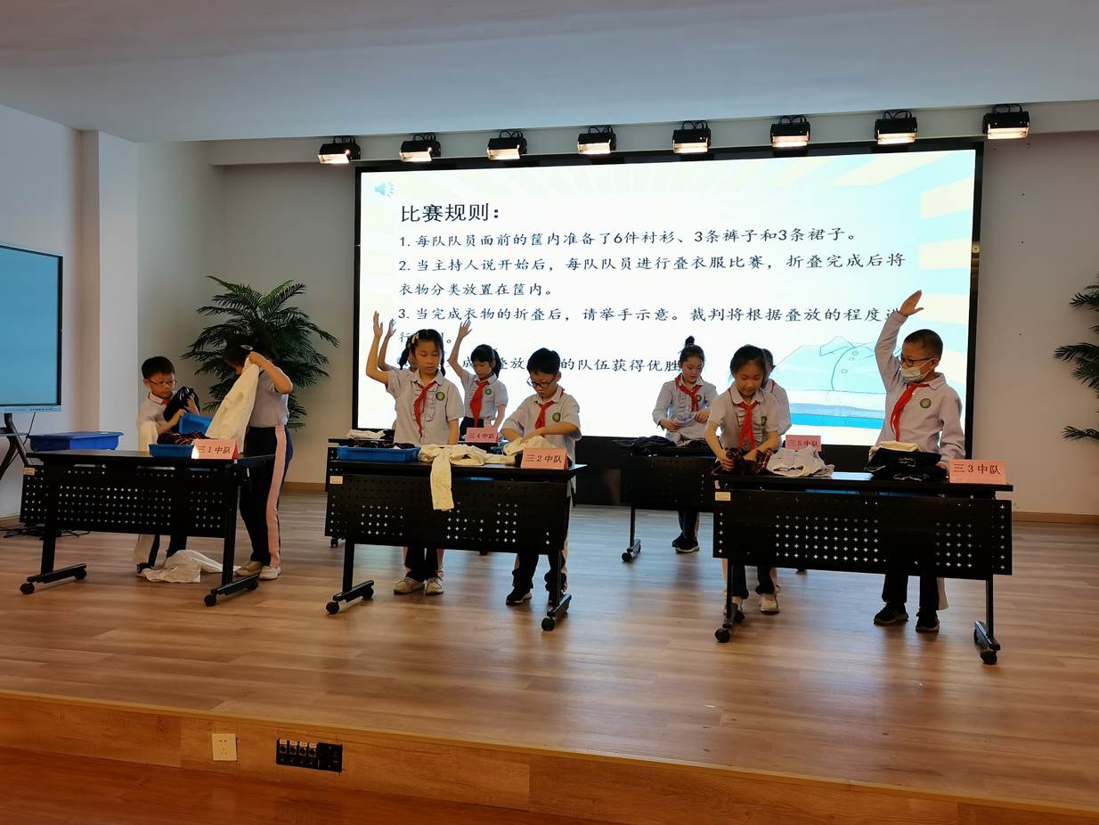 本周是上海市“学生劳动教育宣传周”,伴随着欢快的音乐和成长足迹的展示, 5月11日的三年级十岁生日主题队会上,队员们更是大展身手,你们瞧,这个中队的劳动小达人衣服叠放地又快又整齐。