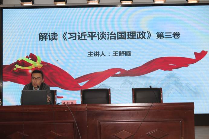 王舒曦的报告围绕“为什么要学习?第三卷的逻辑结构和重点内容是什么?”展开解读。他指出,《习近平谈治国理政》第三卷充分体现了当代中国共产党人的价值追求、科学思想方法和工作方法。从思的角度看,不仅要自我思考,而且要学习交流,深入掌握贯穿其中的马克思主义立场观点方法,做到“知其然又知其所以然”;从践的角度看,做到知行合一、学以致用,切实把学习成效转化为应对风险挑战、推动学校事业发展的治理能力和工作水平;从悟的角度看,不仅要悟原理,还要悟问题,把自己摆进去、把职责摆进去、把工作摆进去。